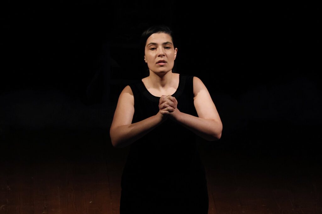 Con la voce spezzata e mitragliata, e scandita come gli spari, con la scarpa destra che ribatte sui legni del palco a riprodurre le bombe e gli spari, con le urla, con le maschere delle espressioni della paura, dell’incredulità, incarnate dal volto, porta la tragedia al centro del palco e nelle ossa e nei nervi di tutti gli spettatori.