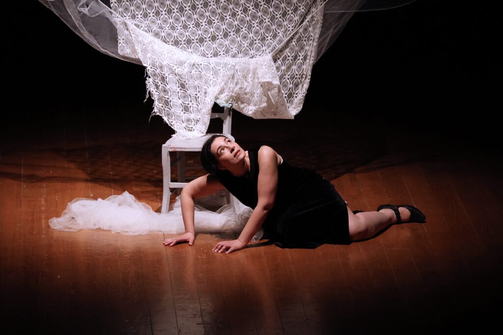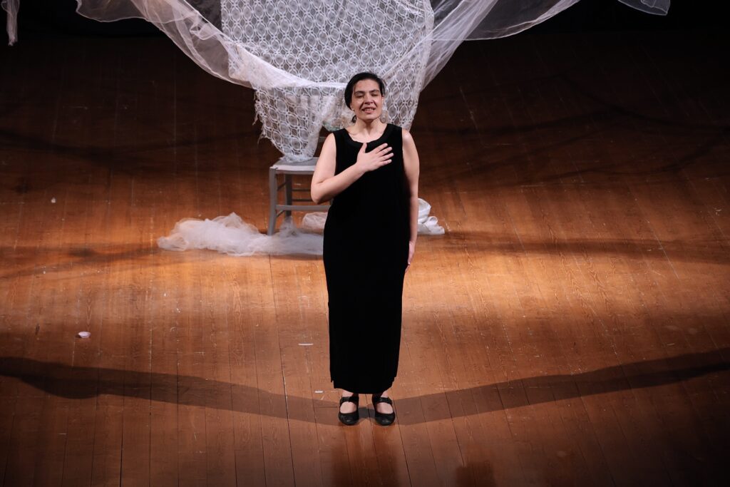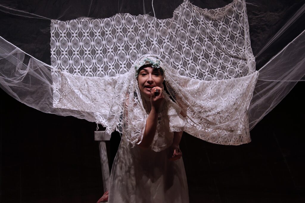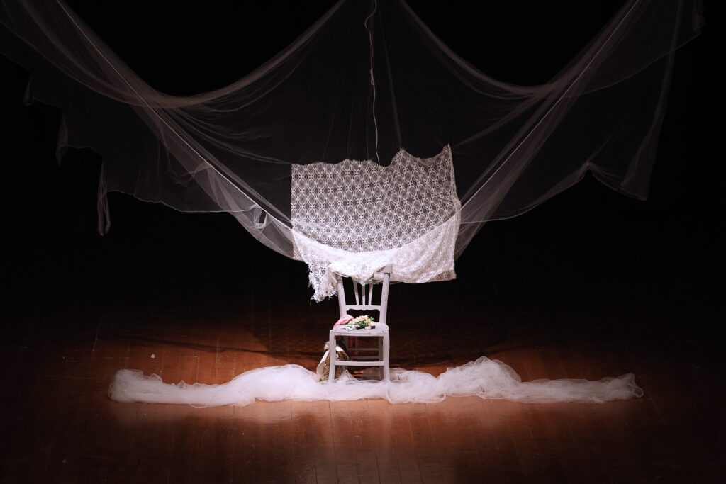 Una scena vuota riempita solo da una sedia di quelle ordinarie di legno e saggina che stavano e stanno in tante cucine popolari. Da quella sedia si diparte una rete appesa al nulla in forma di minaccioso volatile con ampie ali che accoglierà più volte l’attrice che da sola incarna la storia di Itria Scibilia, vedova di Peppu’.