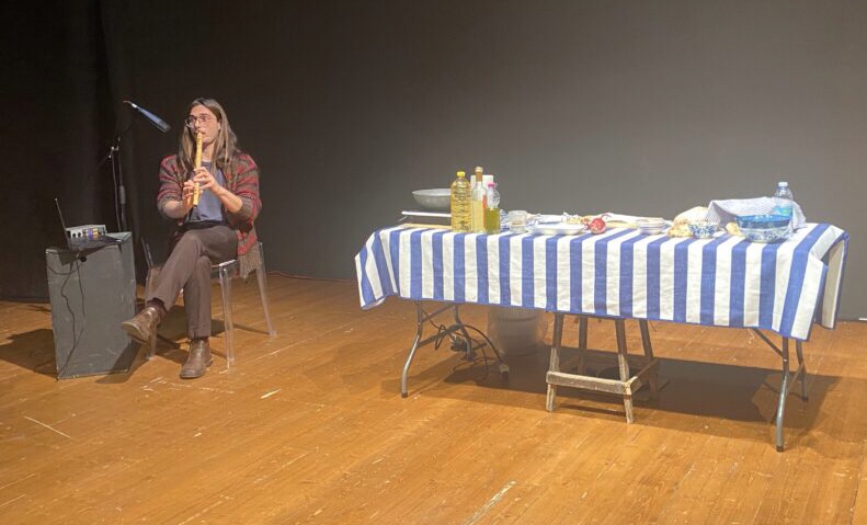 Le polpette immerse nell’olio, Galati viene davanti al tavolo da lavoro e, luci attenuate, flauto e inserti sonori in gran forma, si lascia andare in un pezzo di recitazione sincopata, appassionata, appassionante, un cunto di grande forza, che racconta della repressione, del divieto di digiunare all’aperto (sic) che gli altoparlanti della polizia accorsa in spiaggia rovesciano sui pacifici manifestanti.
