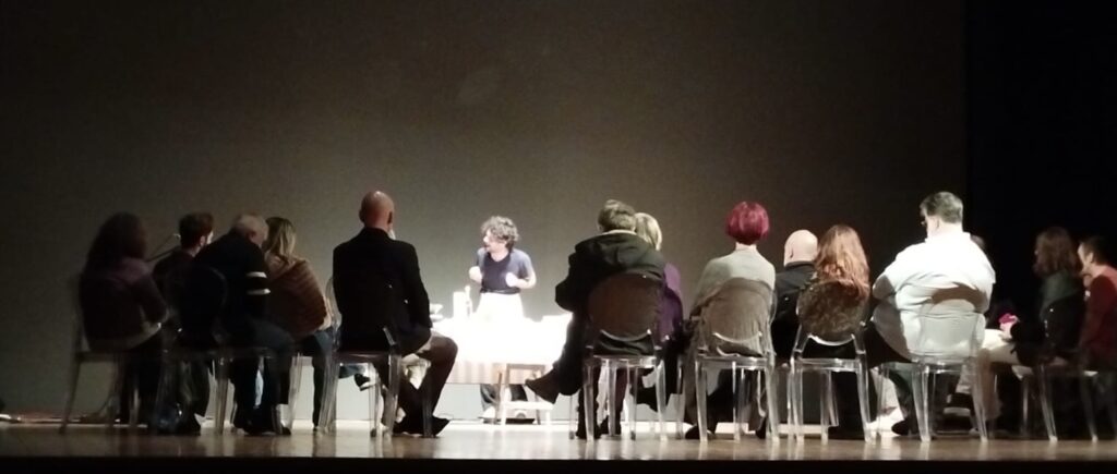 Ieri sera domenica 2 febbraio 2025 sul palco del Teatro Massimo Città di Siracusa, oltre alla scenografia pensata da Barbe À Papa Teatro, hanno trovato posto anche una ventina di sedie disposte in due semicerchi davanti al tavolo di lavoro, spalle alla platea e ai palchi.