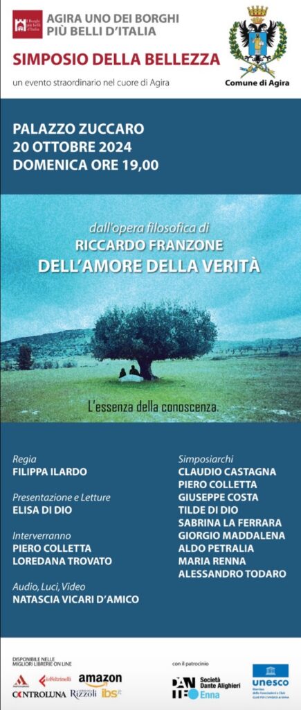 Ispirandosi alle assunzioni contenute nei versi del suo secondo libro di poesia, Dell’amore della Verità, Riccardo ha impostato un progetto di Simposio della Bellezza. Novello Platone, ha immaginato di invitare a condividere un calice di vino sette personaggi che hanno saputo individuare le vie della bellezza e della verità. Ma, distinguendosi dall’originale, ha elaborato le domande che potevano sollecitare questi immensi personaggi, e non ha voluto condizionare le risposte, viziandole con un potenziale cortocircuito.